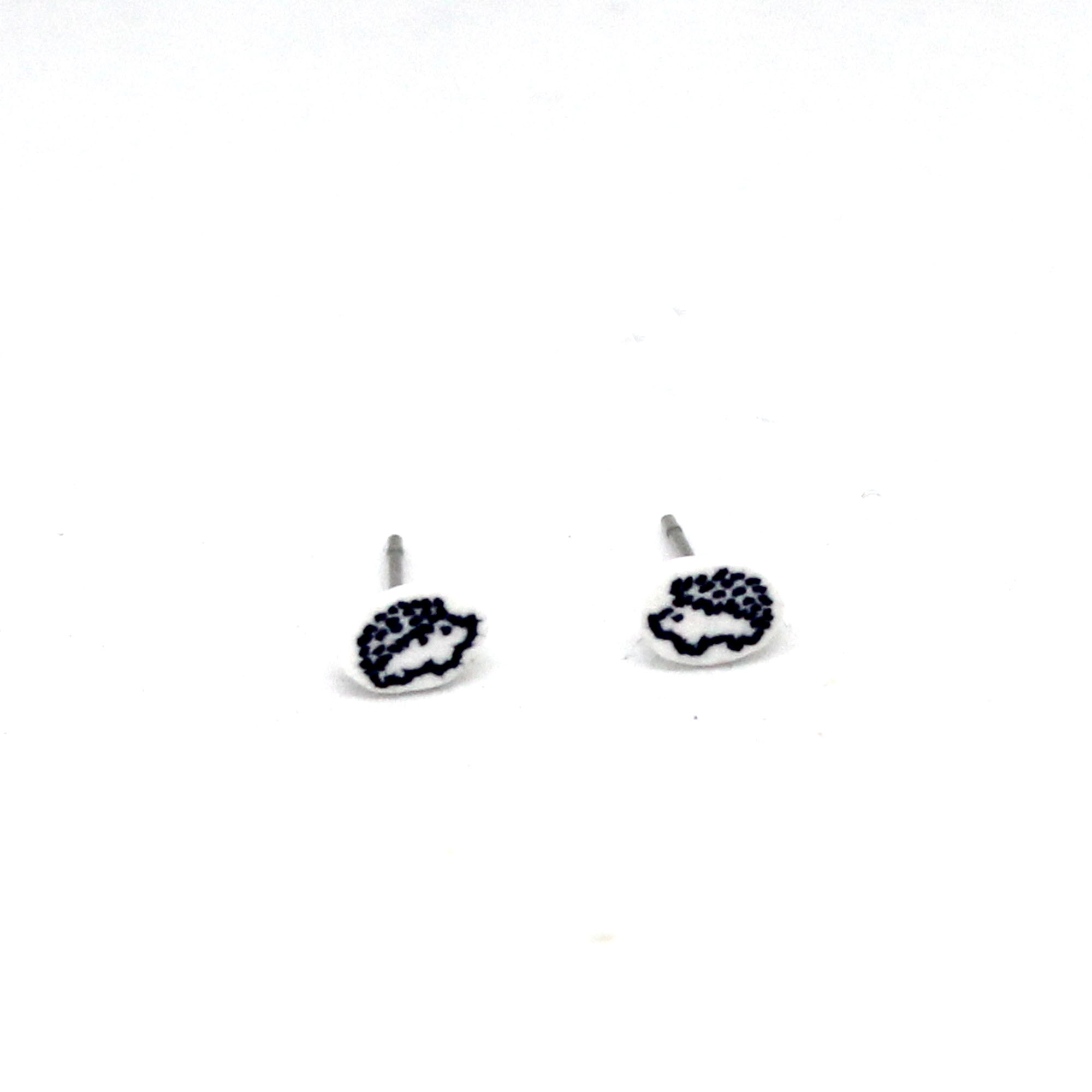 Ručně kreslené náušnice na plastovém recyklátu s motivem mini roztomilých ježečků. Plastový recyklát, přelakováno. Na puzetu z chirurgické oceli. Velikost cca 7 x 5 mm celý popis